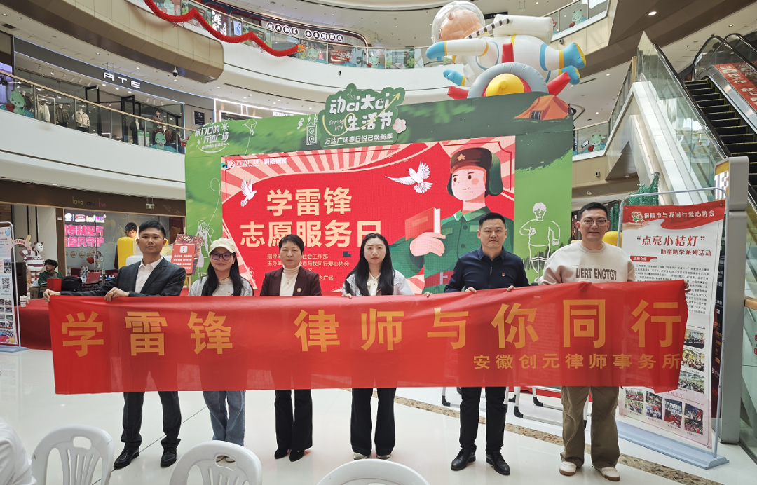 为深入学习贯彻党的二十大精神,弘扬“奉献、友爱、互助、进步”的志愿服务精神,3月2日上午,安徽创元律师事务所律师雷胶东、章帆、汪天剑、赵堃、徐燃然、朱永诚等一行走进铜陵市万达广场,开展“传承雷锋精神、公益宣传活动”,通过法律咨询、普法宣传等形式,为市民提供“零距离”法律服务,以实际行动践行新时代雷锋精神。