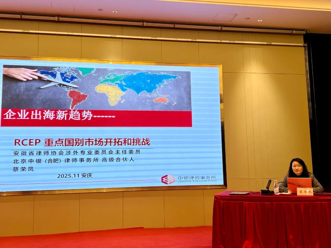 主题演讲环节干货满满。安徽省律师协会涉外法律业务专业委员会主任、北京中银(合肥)律师事务所高级合伙人蔡荣凤以《RCEP下企业开拓新兴市场机遇和挑战》为主题,系统解析了企业在开拓东南亚等新兴市场过程中面临的机遇与挑战,并就法律风险防控提出专业建议。